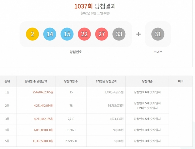 1 day ago제 1037회 로또복권 추첨에서 2 14 15 22 27 33이 1등 당첨번호로 뽑혔다.